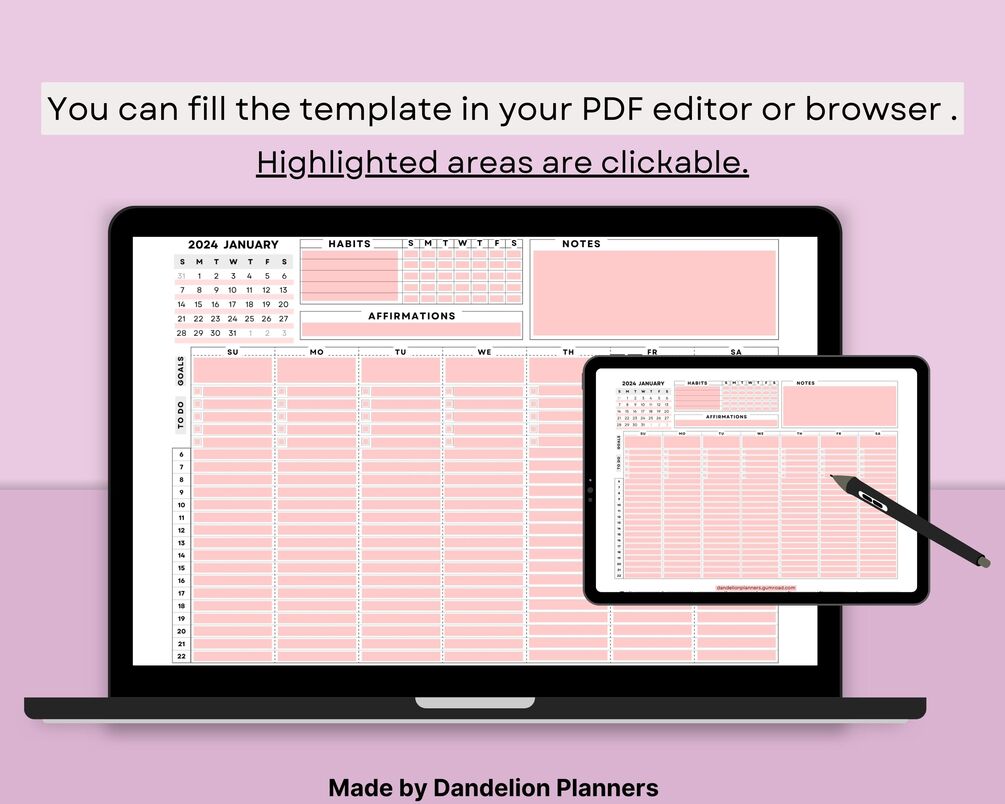 Month At a Glance, Weekly Habit Tracker, Schedule, To Do List, Goals, Notes & Affirmations.