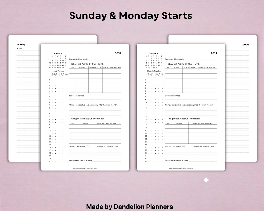 Month At a Glance, Mood Tracker, 5 Highest Points of The Month, 5 Lowest Point of The Month, Gratitude and Monthly Notes.