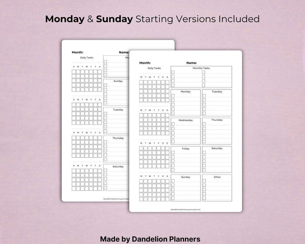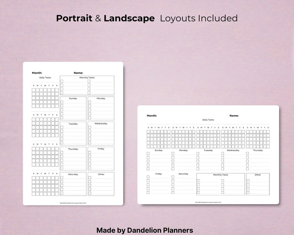 Includes: 2 Layouts (Portrait & Landscape) 2 Versions (Sunday & Monday Start)