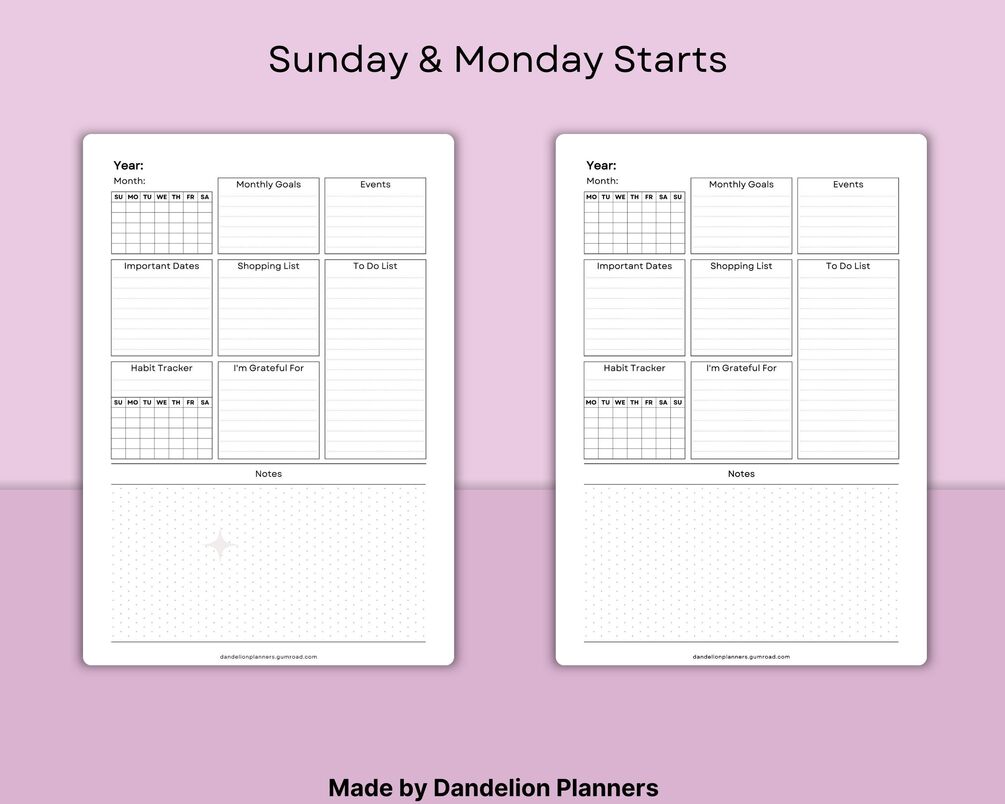 Monthly Planner, Monthly Goals, Monthly Events, Monthly Important Dates, Monthly Shopping List, Monthly To Do List, Monthly Habit Tracker, Monthly Gratitude, Monthly Notes