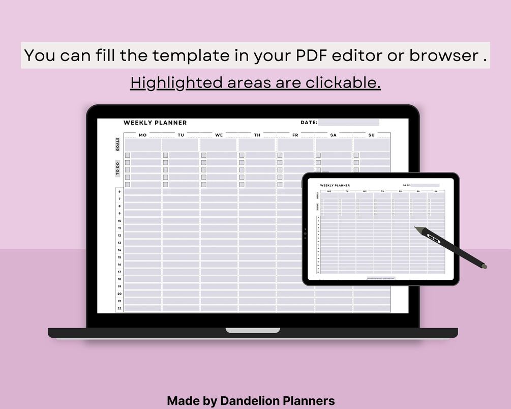 Includes: Sunday & Monday Start Versions, 1 Page Of Undated 1 Week Planner, 1 Week Daily Goals, 1 Week Daily To Do List, 1 Week Daily Schedule (From 6 to 22), Scrolling Text Fields For Digital Fill-Out